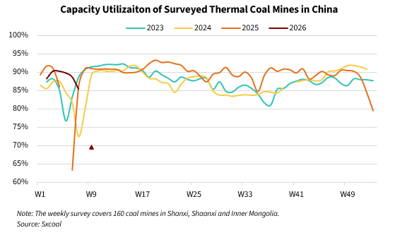 Overall supply tightness provided a backbone to the current price rally. According to Sxcoal's latest weekly survey covering 160 thermal coal mines, the capacity utilization of these mines averaged 69.54% over February 19-25, contracting 15.92 percentage points from the pre-holiday level, a direct consequence of widespread holiday closures.