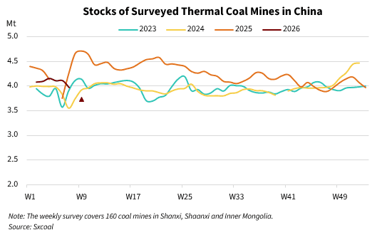 Meanwhile, overall mine inventories hovered at relatively low levels, with total stockpiles at Sxcoal-surveyed mines decreasing 5.77% from the pre-holiday level to 3.74 million tonnes on February 25.