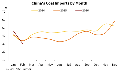 Looking ahead, China's coal imports are expected to be subdued in March, traditionally a slack season for power coal demand. Uncertainty over Indonesian supply and the fading of any clear price edge for imported supplies would weigh on thermal coal imports. Yet March is also a peak period for the non-power sectors, which may offer some support to coking coal.