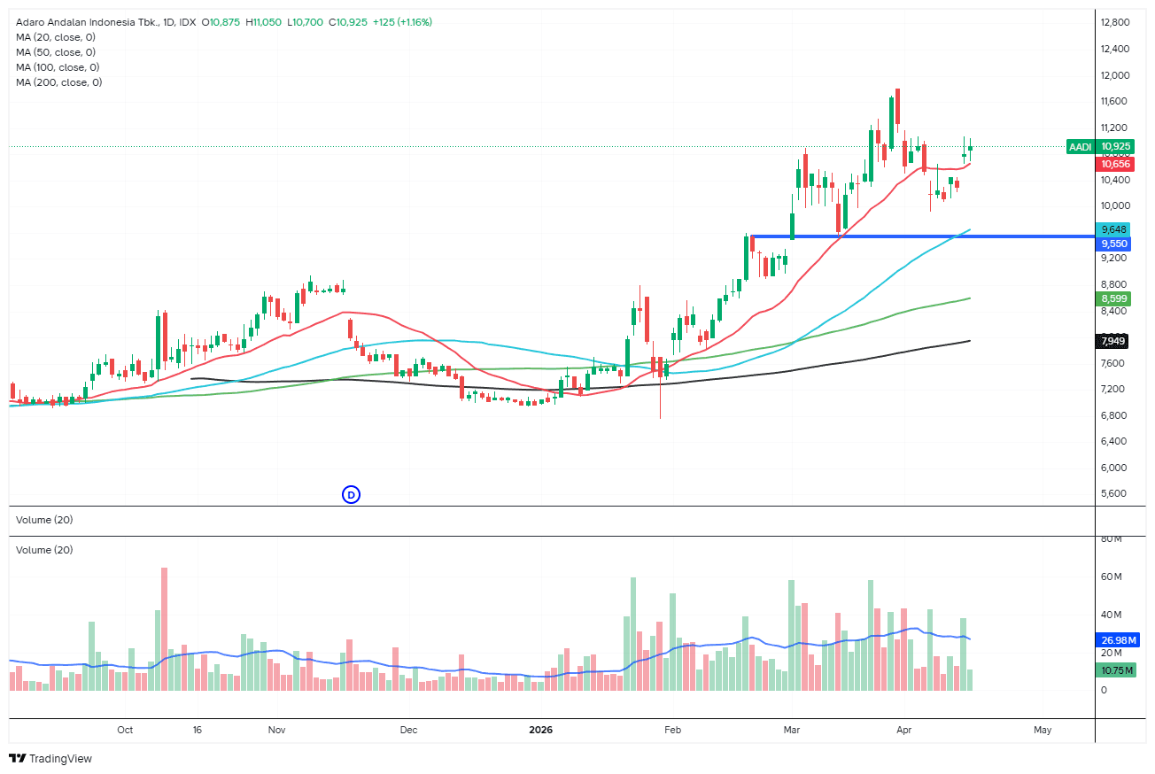 Berkat itu, kami menilai kinerja operasional AADI di kuartal I/2026 bisa lebih positif dibanding tahun sebelumnya, terlebih RKAB yang dijalankan masih fleksibel menggunakan rencana tahun lalu, jadi produksi cenderung aman.