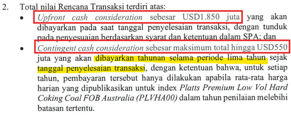 Struktur transaksi terdiri dari pembayaran awal sebesar US$1,85 miliar atau sekitar Rp31,45 triliun menggunakan kurs Rp17.000/US$, serta tambahan pembayaran bersyarat hingga US$550 juta atau sekitar Rp9,35 triliun dalam jangka waktu lima tahun, yang bergantung pada harga batu bara kokas global (indeks Platts di atas US$225/ton).