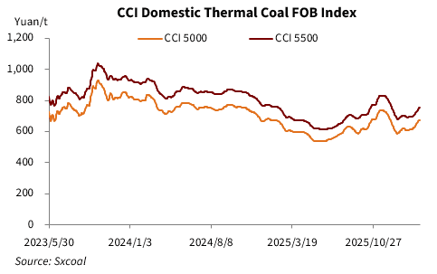 As of February 28, the CCI Index for 5,500 Kcal/kg NAR coal traded at Qinhuangdao port stood at 750 yuan/t, up 54 yuan/t from end-January and 69 yuan/t above the end of last year. The index for 5,000 Kcal/kg NAR coal was at 671 yuan/t, rising 57 yuan/t from the end of January.