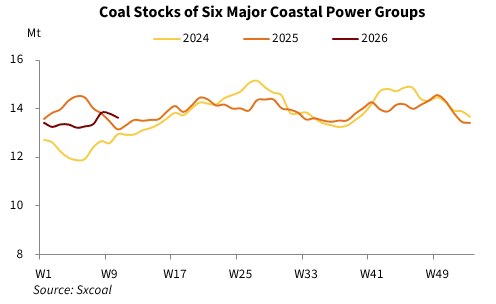 After the holiday, a gradual return to work and production lifted industrial electricity consumption, nudging up coal burn at power plants. As of March 3, daily coal consumption at the six major coastal power groups stood at 698,000 tonnes, up 19.42% from February 24, the first workday after the holiday, yet 15.23% below the same period last year, Sxcoal data showed.