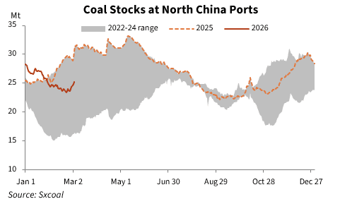 Coal inventories at northern ports have risen noticeably. Coal stocks at northern ports, including Qinhuangdao, Jingtang, Caofeidian, and Huanghua, reached 25.24 million tonnes by March 3, 6% higher than that on February 24, as per Sxcoal data. This figure remained in the mid-to-upper range of the past six years, even as it was 17.37% below last year's level.