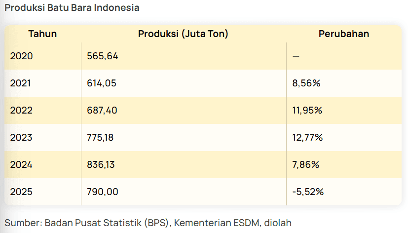 Kementerian ESDM sebelumnya menyebutkan target produksi untuk 2026 adalah sekitar 600 juta ton. Jumlah tersebut jauh di bawah realisasi produksi batu bara nasional pada 2025 yakni sebesar 790 juta ton dan sebesar 834 juta ton pada 2024.