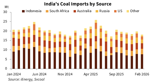 By origin, Indonesia remained India's largest coal supplier in February, shipping 7.70 million tonnes, up 7.46% YoY yet down 0.88% MoM. South African coal arrivals gained 13.91% YoY and 18.44% MoM to 2.95 million tonnes.