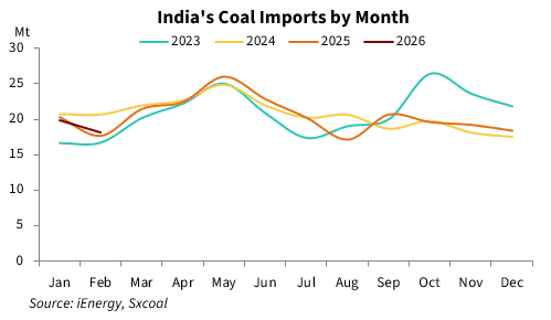 Domestically, India's coal output maintained a YoY growth since the beginning of this year, partially curbing import needs. India produced 208.5 million tonnes of coal over January-February, up 2.8% YoY.