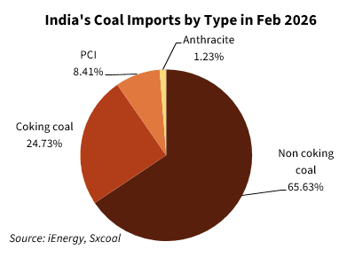 In breakdown by type, the South Asian nation imported 11.88 million tonnes of non-coking coal in February, down 0.23% YoY and 5.92% MoM, while anthracite imports declined by 18.07% YoY and 27.41% MoM to 222,500 tonnes.