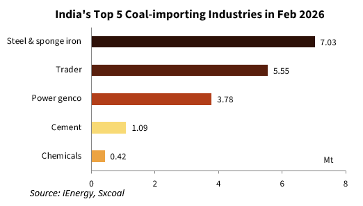 India's steel and sponge iron industries imported most coal in February, hitting 7.03 million tonnes, falling 2.96% YoY and 10.55% MoM, as per iEnergy data.