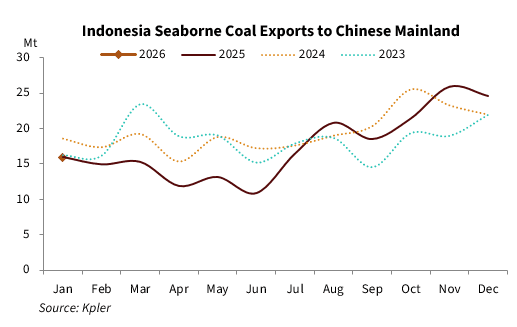Indonesia coal exports fall below 40 Mt for in Jan, Kpler