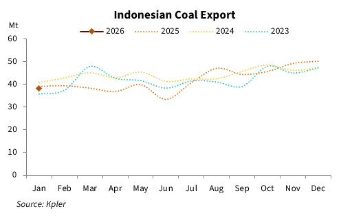 Indonesia's seaborne coal exports slumped over 20% in January from the month-ago high level and fell below the 40 million tonnes threshold, showed vessel tracking data from Kpler.