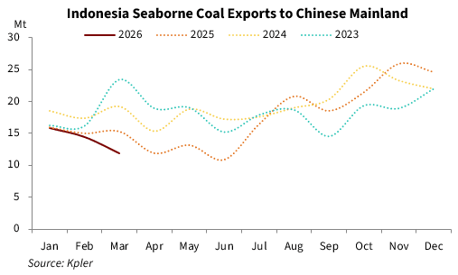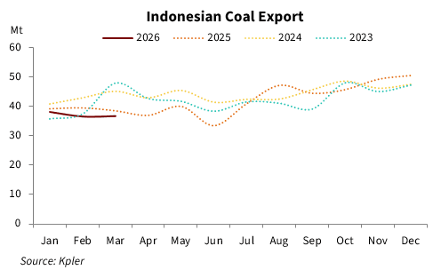 Indonesia's seaborne coal exports totaled 36.68 million tonnes in March, down 4.76% compared with March 2025, while up 0.41% from 36.53 million tonnes in February 2026, data from Kpler showed.