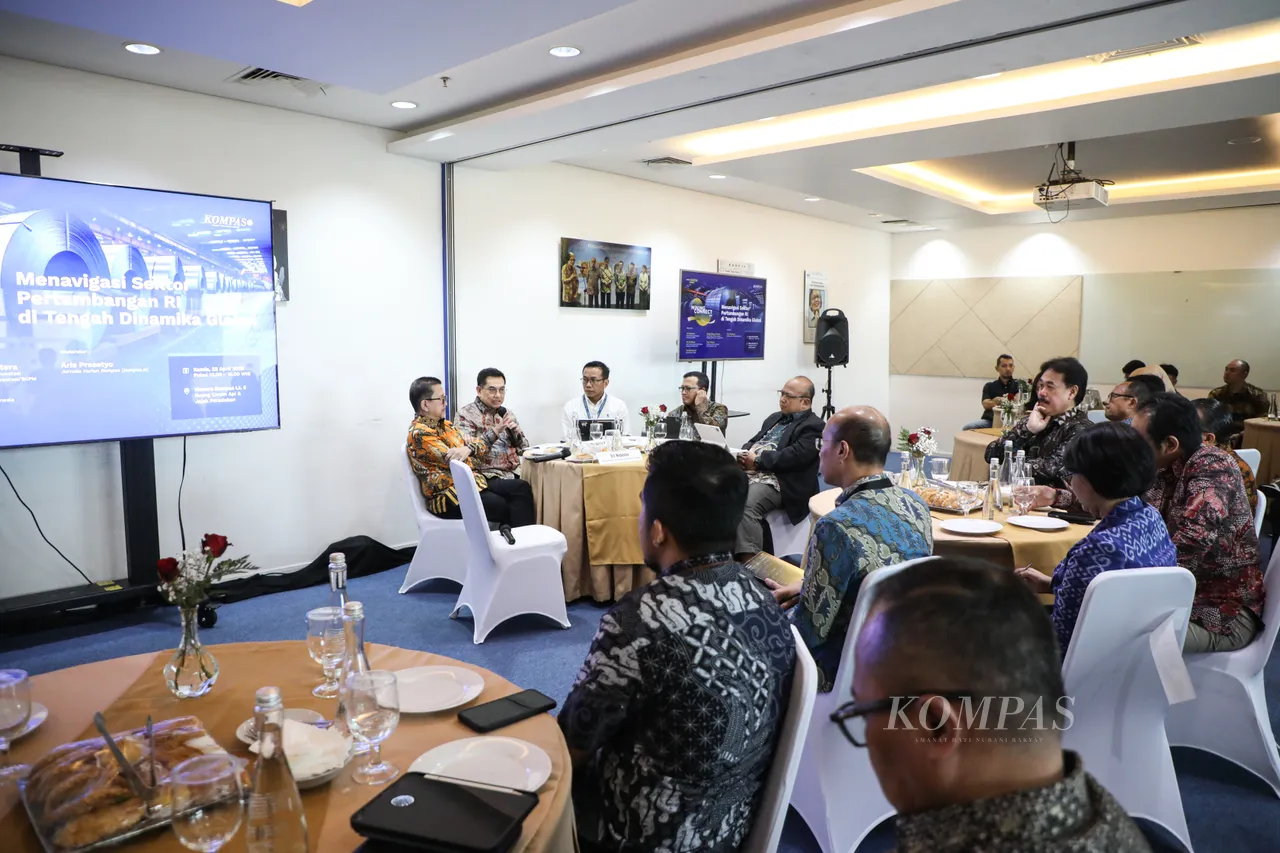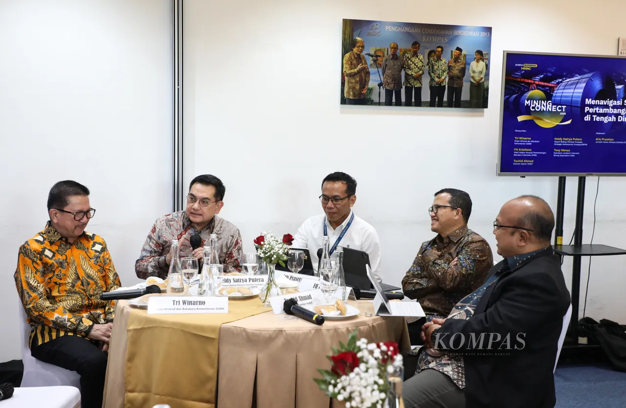 Suasana diskusi Mining Connect 2026 yang mengusung tema "Menavigasi Sektor Pertambangan RI di Tengah Dinamika Global" di Menara Kompas, Jakarta, Kamis (23/4/2026). Diskusi menghadirkan narasumber Sekretaris Jenderal Indonesia Mining Association (IMA),Tony Wenas, Deputi Bidang Hilirasi Investasi Strategis Kementerian Investasi/BKPM Heldy Satrya Putera, Wakil Sekjen Asosiasi Pertambangan Batubara Indonesia FH Kristiono dan Ekonom Senior INDEF Tauhid Ahmad serta moderator wartawan Kompas Aris Prasetyo.