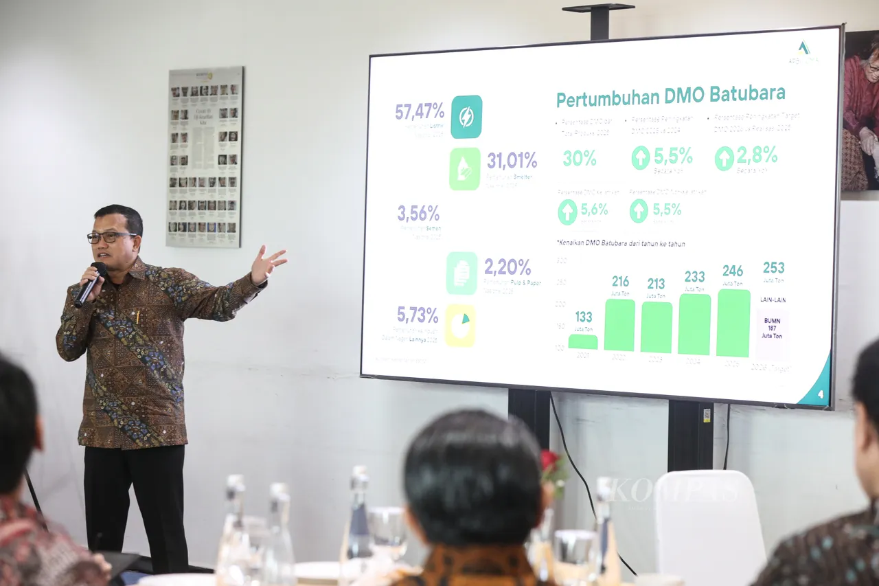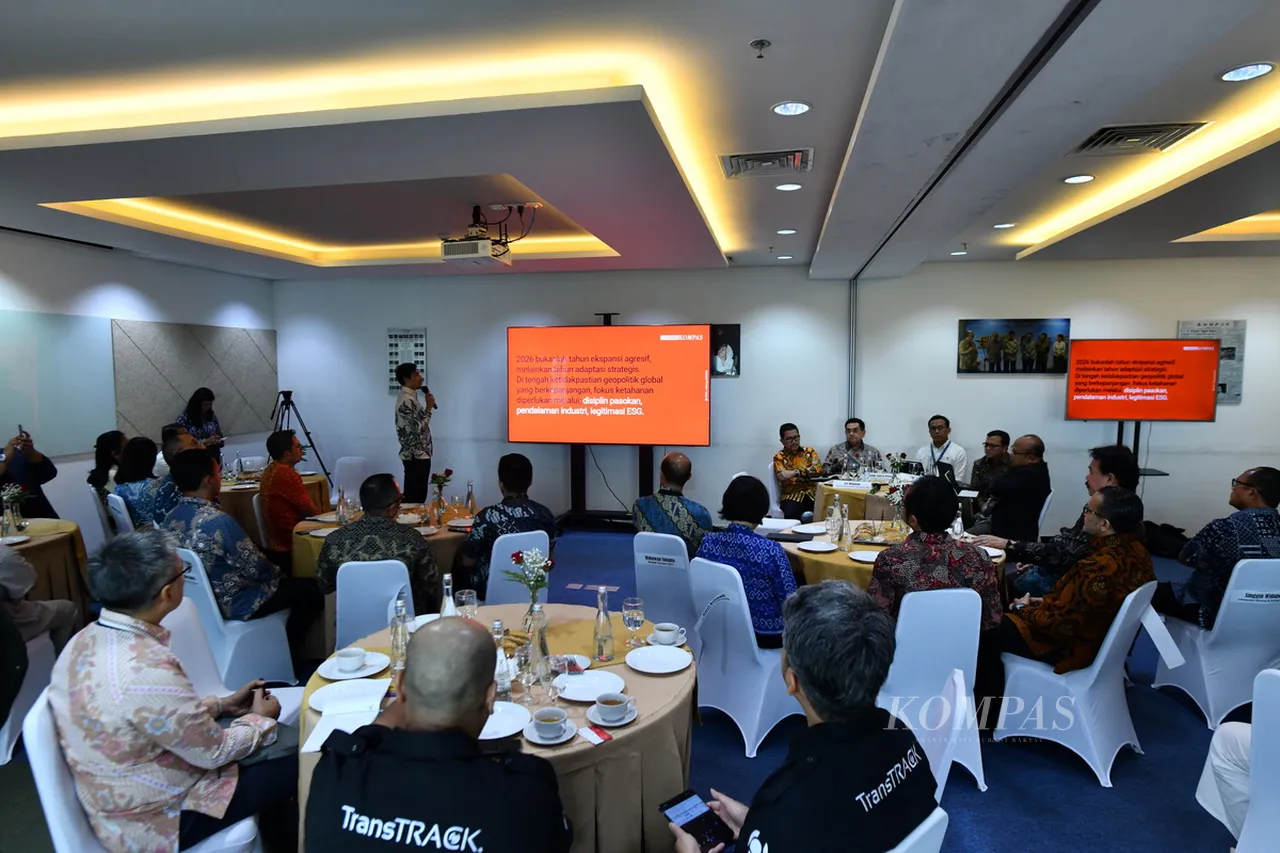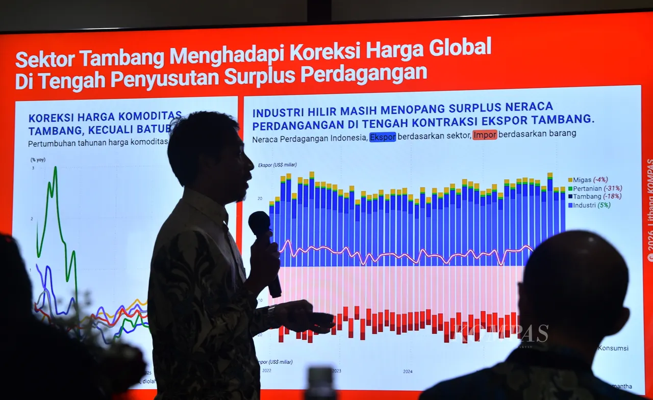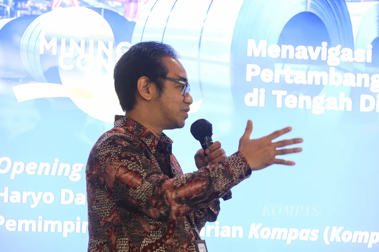 Peneliti Litbang Kompas Budiawan Sidik menyampaikan pemaparan terkait mining outlook dalam diskusi Mining Connect 2026 yang mengusung tema "Menavigasi Sektor Pertambangan RI di Tengah Dinamika Global" di Menara Kompas, Jakarta, Kamis (23/4/2026). Diskusi menghadirkan narasumber Sekretaris Jenderal Indonesia Mining Association (IMA), Tony Wenas Deputi Bidang Hilirasi Investasi Strategis Kementerian Investasi/BKPM Heldy Satrya Putera, Wakil Sekjen Asosiasi Pertambangan Batubara Indonesia FH Kristiono dan Ekonom Senior INDEF Tauhid Ahmad serta moderator wartawan Kompas Aris Prasetyo.