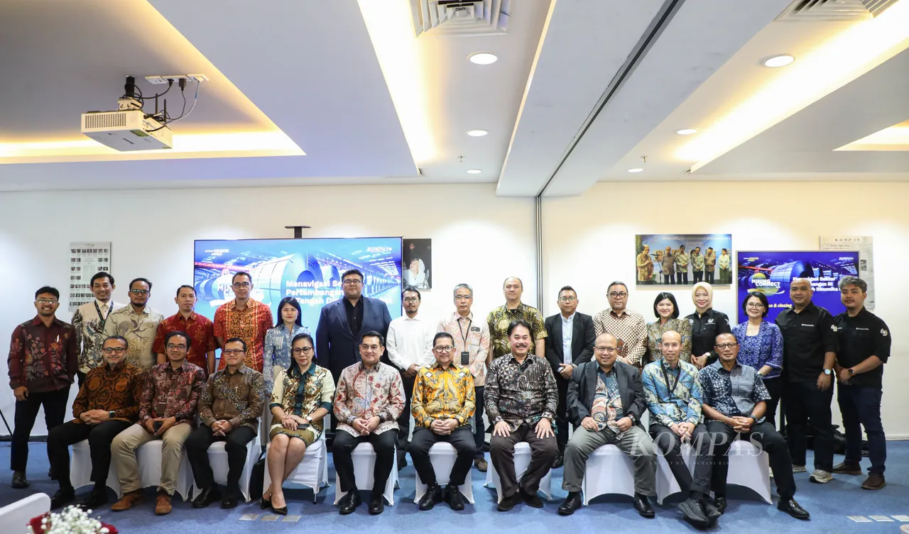 Para pembicara dan peserta diskusi Minning Connect 2026 berfoto bersama di Menara Kompas Jakarta, Kamis (23/4/2026).