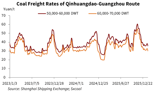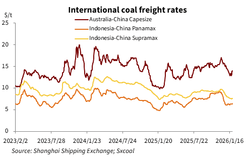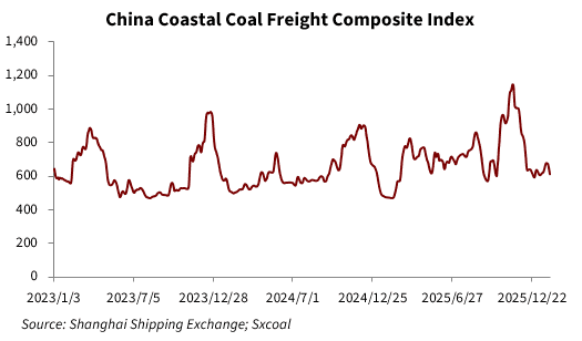 China's coastal coal freight rates fluctuated at a trough in January, showing a month-on-month decline due to weaker cold wave impacts. Loose supply-demand dynamics for vessels have yet to improve, further weighing on the market.