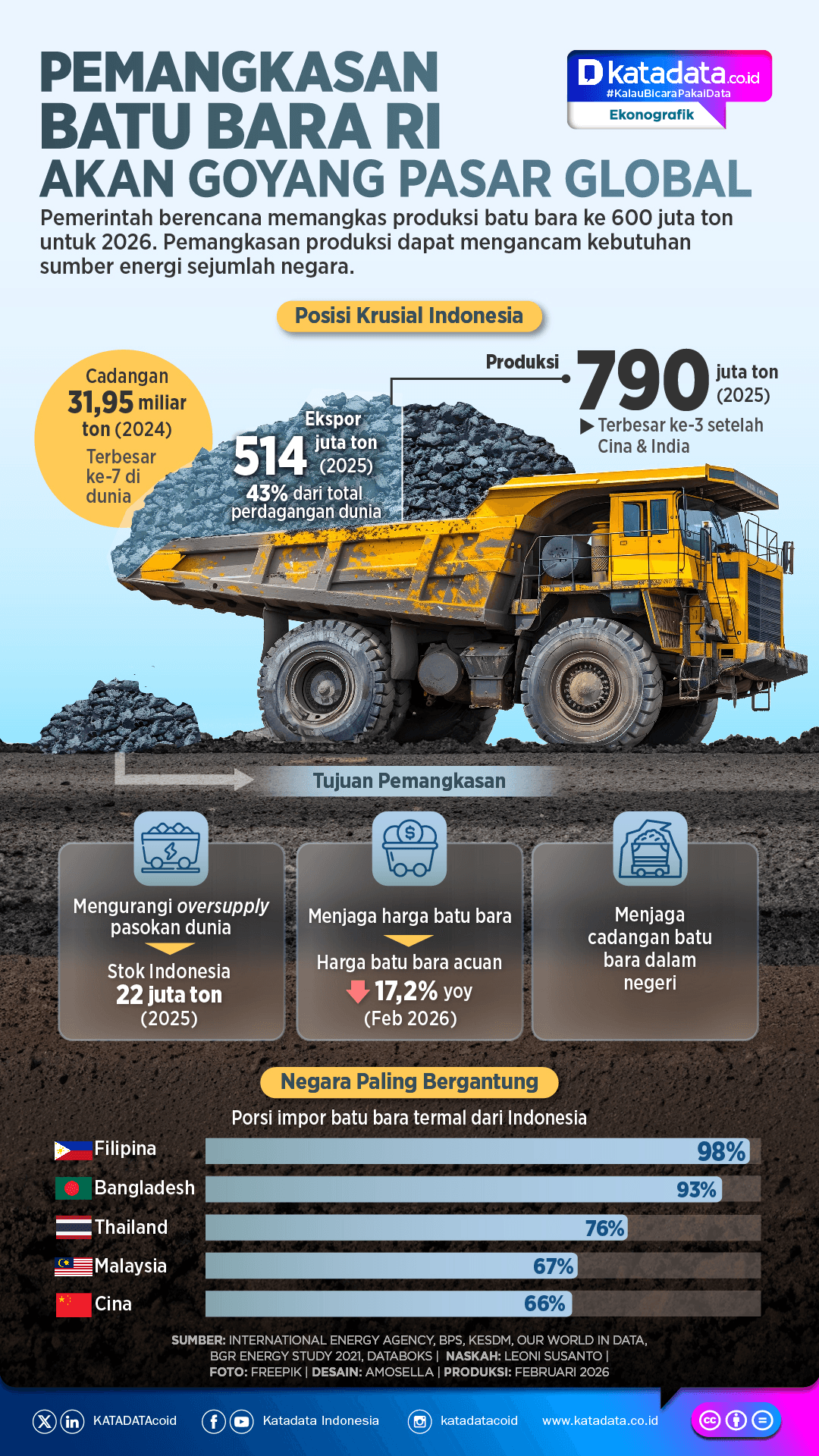 Pemerintah memangkas kuota produksi perusahaan pertambangan batu bara dalam Rencana Kerja dan Anggaran Biaya (RKAB) 2026. Produksi akan turun dari 790 juta ton pada 2025 menjadi 600 juta ton tahun ini.