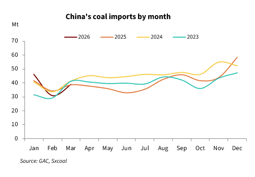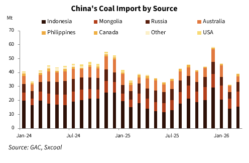 China's coal imports rebounded strongly in March 2026 from a weak February base impacted by the Chinese New Year, with shipments from Mongolia rising sharply by more than 4 million tonnes from the previous month.