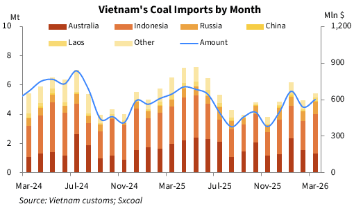 Vietnam's coal imports increased notably in March 2026, rising nearly 10% compared to the previous month. Imports from Indonesia saw particularly strong growth, both month-on-month and year-on-year.