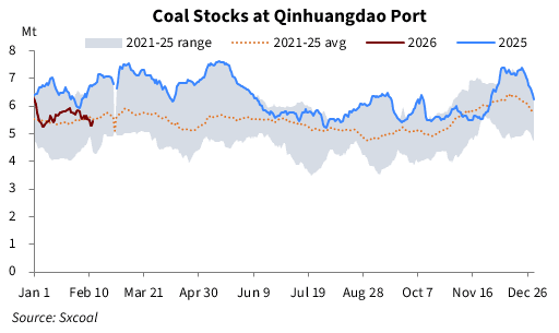 Qinhuangdao, one major coal transshipment port in northern China, saw coal stockpiles tumble further in the week ending February 13, as offtakes continued to outpace rail inflows at the port.